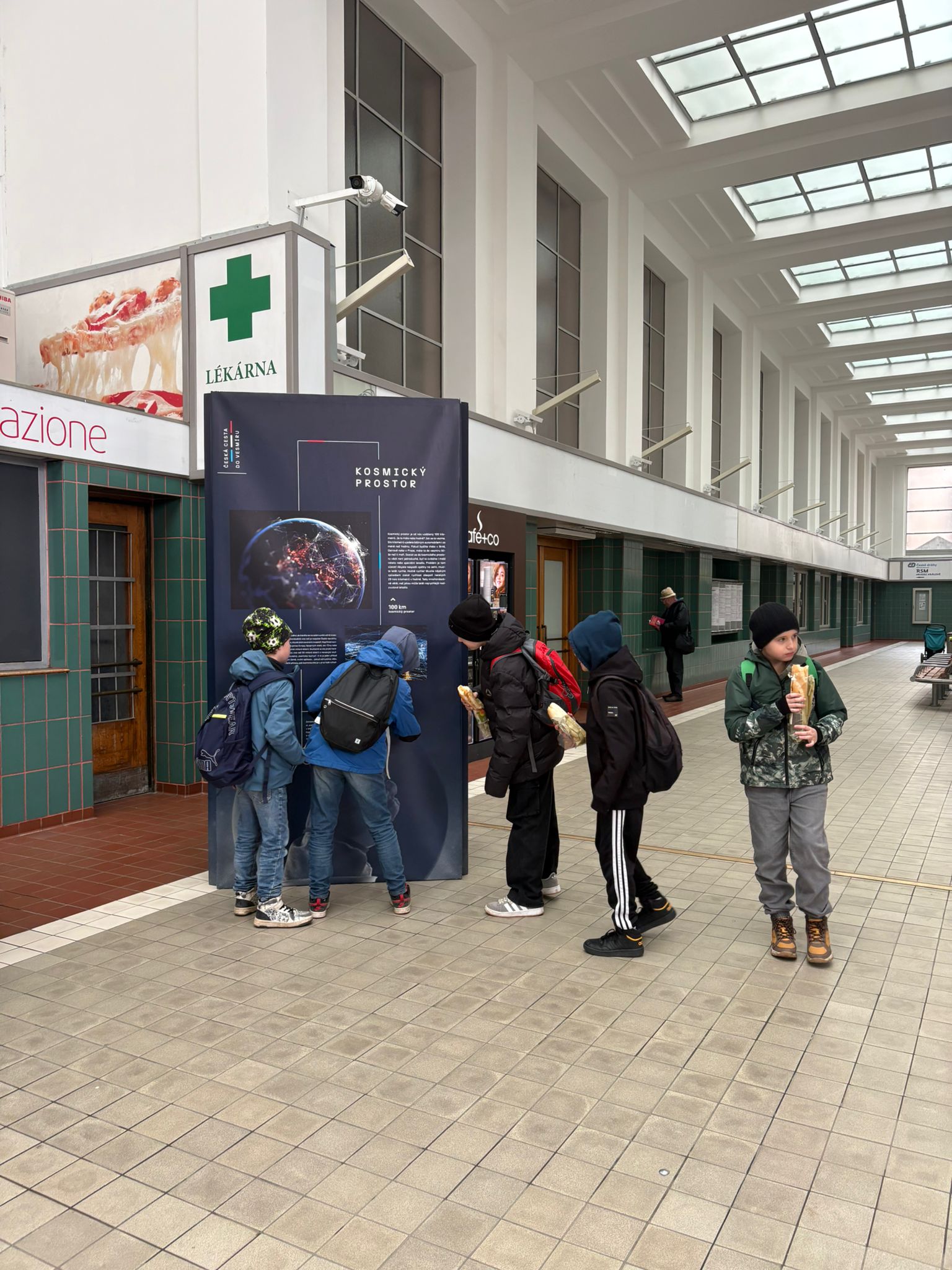 Vlakem jsme se dopravili do Hradce Králové, kde se na hlavním nádraží – se skvělým načasováním pro naši výpravu – nachází putovní výstava o vesmíru. Dali jsme si dostatek času a informační tabule si prostudovali. Stejně tak i obchůdky s občerstvením. 🙂